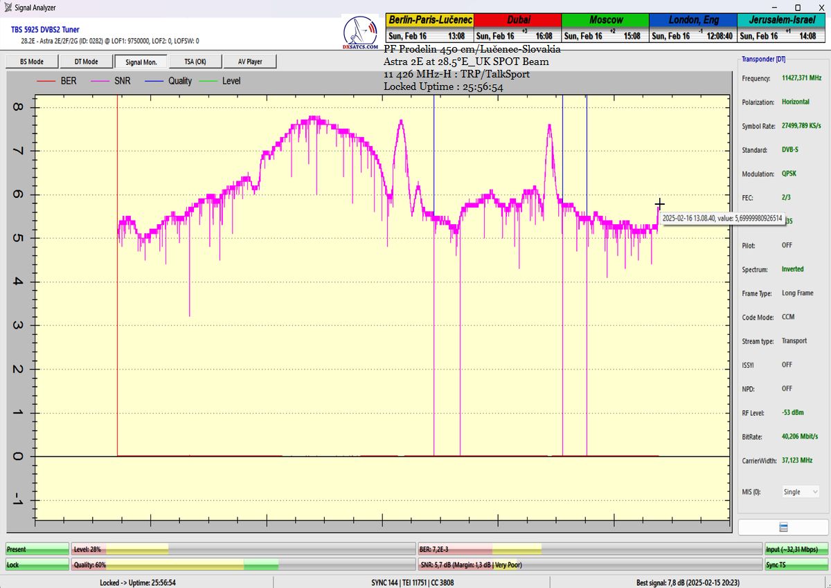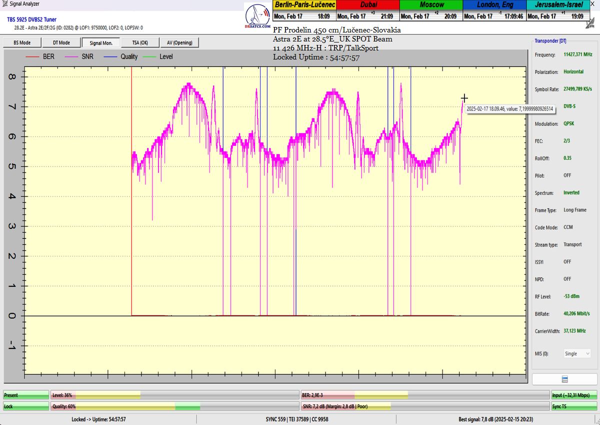 "Synchronisierte Nanokorrektur" beim Empfang des Transponders TP 115 von Satellit Astra 2E auf 28,5°E im UK SPOT BEAM-Bereich in Lučenec im Süden der zentralen
