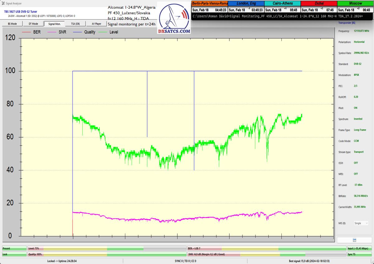 28.2.2024 : Author Roman Dávid is the first in Europe to achieve stable reception at 100% without a single dropout in the continuity of the Lock carrier with peak quality SNR=15.6 dB at the monitored frequency f=12 160 MHz in the geographical location of Central Europe and in the verification unit of t=72 hours with a reflector of a given diameter,provided by the Algerian provider TDA from the Alcomsat 1 satellite at 24.8°W.