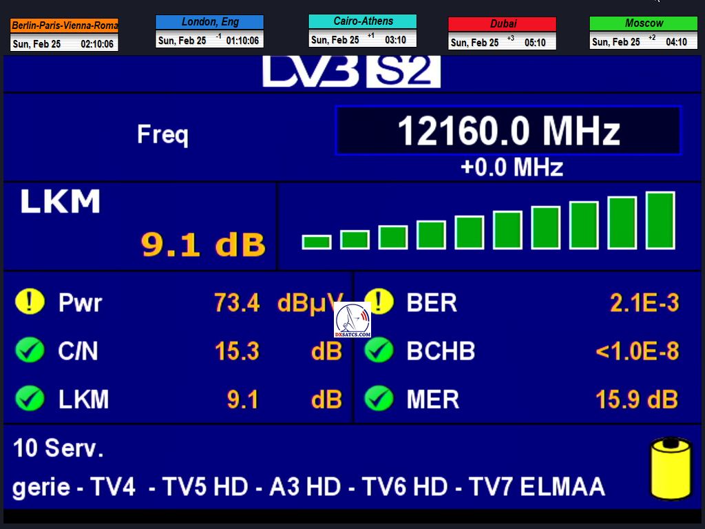 LKM=9.1 dB > MER=15.9 dB > C/N=15,5 dB > Pwr=73.6 dBµV