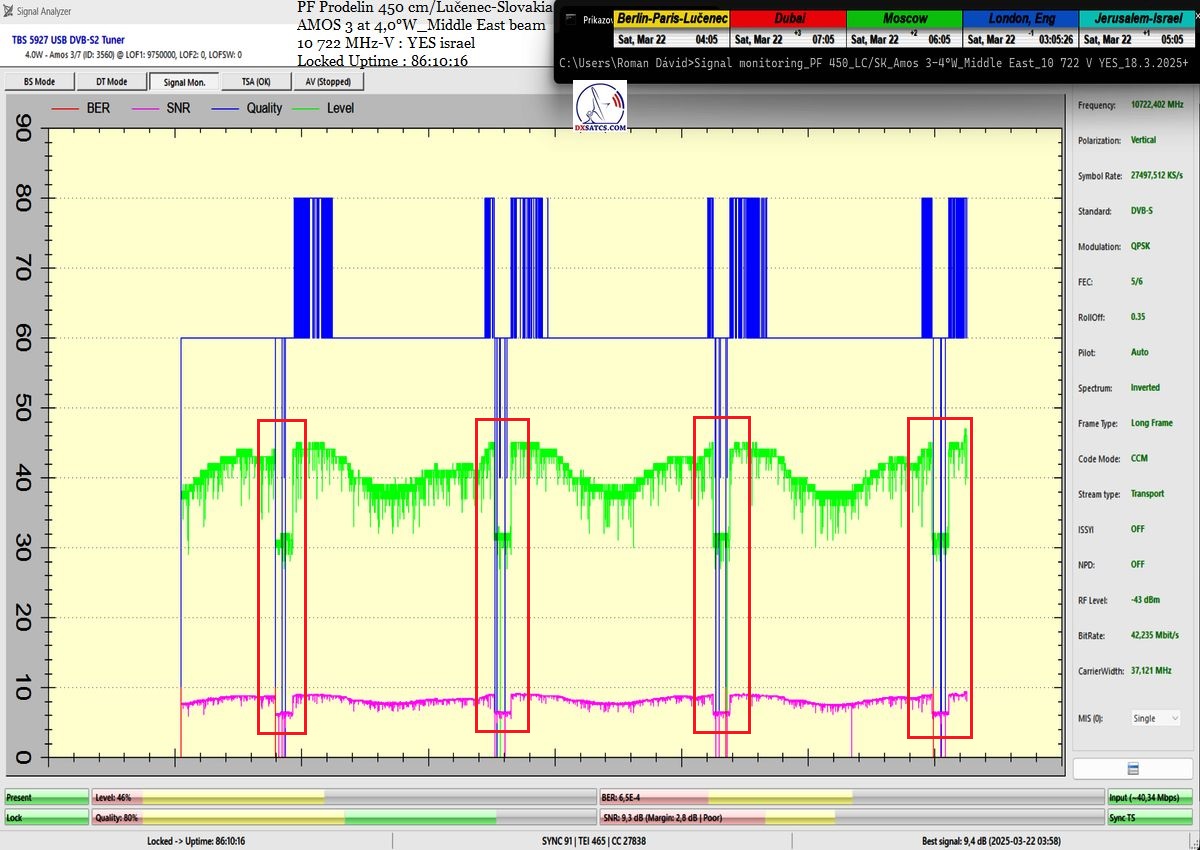 ►►Amos 3 at 4.0°W-Middle East-10 722 MHz-V_YES Israel : Analysis of signal monitoring over a duration of t=80 hours