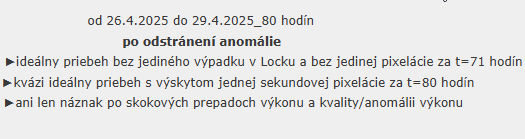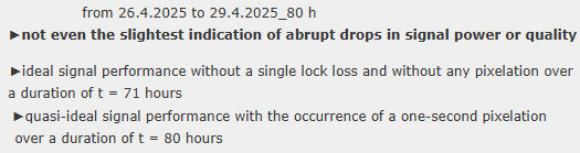 zamrznutia a výpadku v Locku za jednotku t=71 hodín,a kvázi ideálny stav v stabilite príjmu len s výskytom jedinej sekundovej pixelácie za jednotku monitorongu t=80 hodín, čo som vyhodnotil ako uspokojivý výsledok a s monitoringom som nezačínal odznovu ešte jeden krát,pretože nemá žiadny význam detailne sa zaoberať jednou sekundovou pixelácie z celkovo monitorovaných 288 000 sekúnd,pretože jej príčina môža byť akákoľvej,napríklad prelet operenca,prítomnosť hmyzu na ožarovači atď...