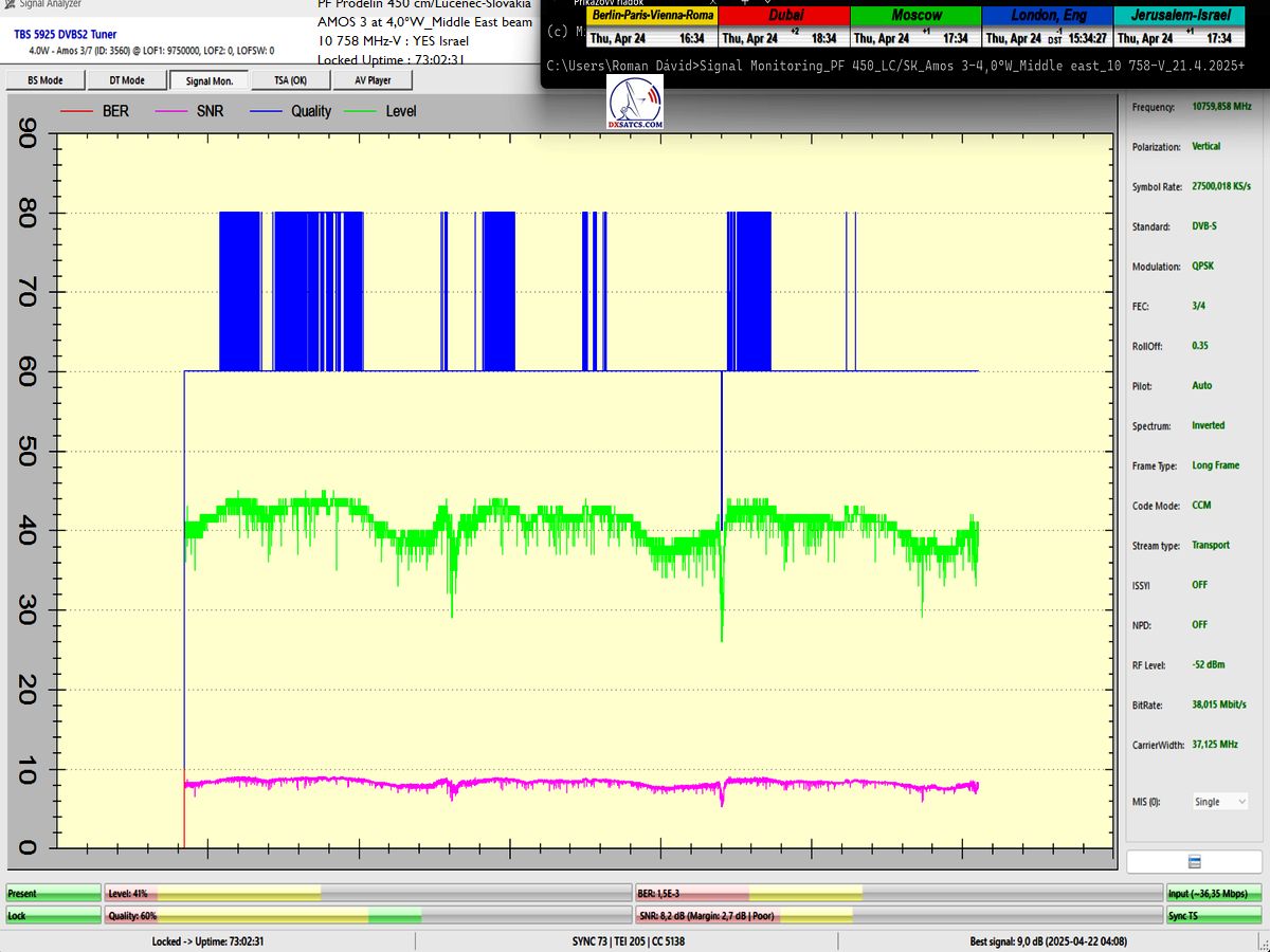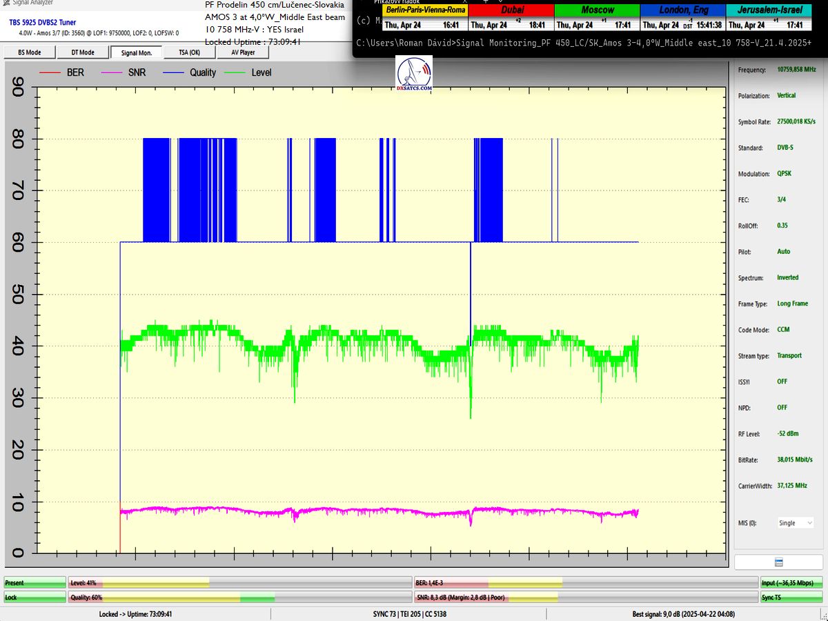 ►►Amos 3 at 4.0°W-Middle East-10 758 MHz-V_YES Israel : Analysis of signal monitoring over a duration of t=73 hours