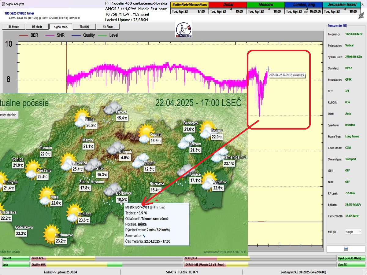 -okamžitá kvalita osciluje okolo: SNR=8,3-8,5 dB - pár minút po búrke v mieste príjmu ,ale ani len jedna pixelácia,alebo zamrznutie