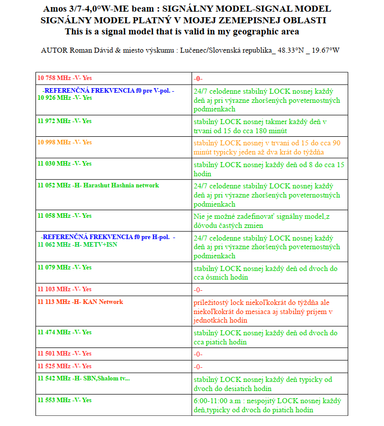 ►16.6.2021 : Názov štúdie : Autor Roman Dávid skúma a analyzuje vzťah medzi počtom nosných,ktoré konštantne zdielajú danú šírku pásma TP "X" na f=11 046 MHz s BW=54 MHz a výsledným signálnym modelom,alebo kontinuitou priebehu LOCKU nosnej na f=11 052 MHz vo vyžarovacom diagrame stredný východ družice Amos 7 na 3,9°W .