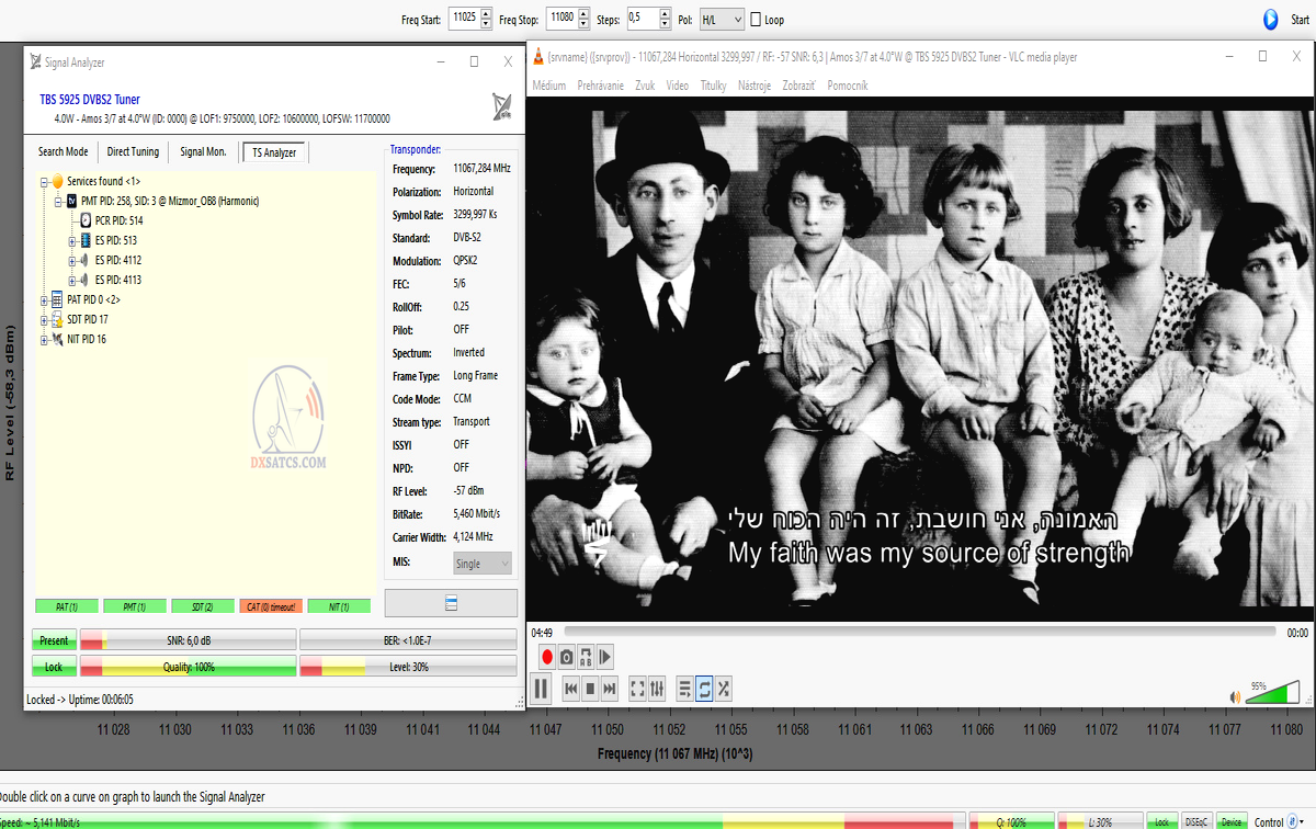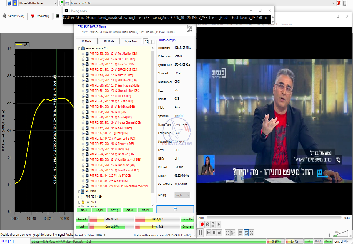 prenosu vo frekvenčnom spektre v definovanej zemepisnej polohe,na súčastnú a zároveň vôbec prvú demonštráciu uzamknutia a kvality príjmu nosnej izraelského tv paketu YES na f=11 554 MHz,ktoré kontinuálne,čiže bez výpadkov v možnosti uzamknutia,trvá od približne 6:00 ráno,už