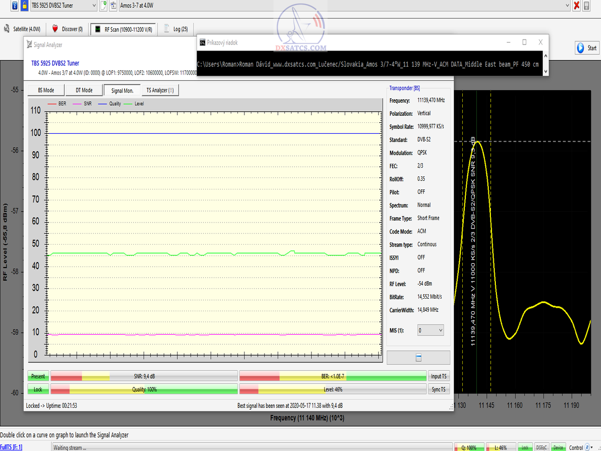 ►16.8.2020 : PREMIÉRA od autora Romana Dávida : PRVÝ kontinuálne prítomný (stabilne detekovatelný) LOCK nosnej KAN Izrael na f=11 113 MHz v centrálnej európskej zóne z družice AMOS 7-3.9°W s amplitúdou kvality až MER=9,2 dB ...