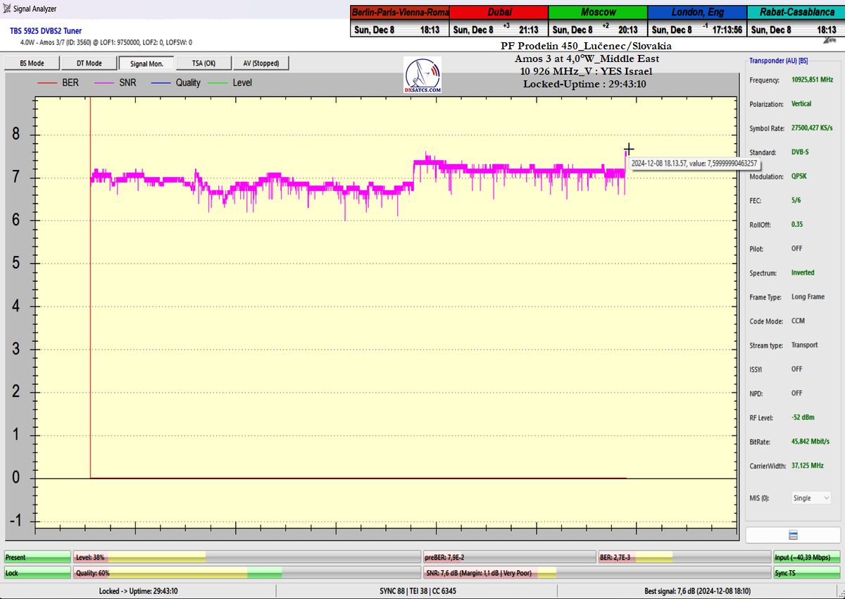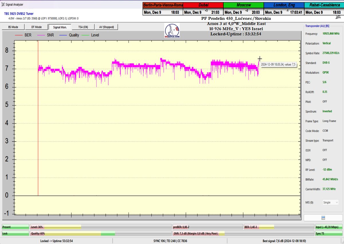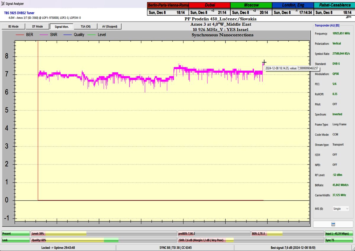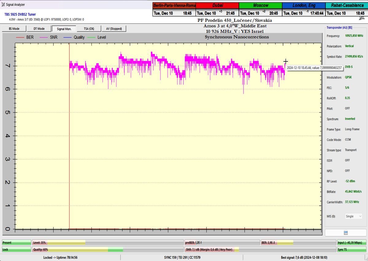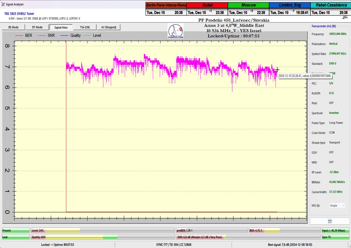 question the relevance of the result due to a short monitoring duration. I fully agree that sufficient evidentiary weight undoubtedly holds the highest importance or priority in proving the reception stability of a carrier available only in microintensity EIRP performance in the geographic area of Central Europe. This region is particularly characterized by highly dynamic changes in power intensities within the non-guaranteed "Out of Footprint" zone.As evidenced by the progression of signal monitoring, a peak quality at the level of SNR=7.6 dB was demonstrated after the successful application of my technology, "Synchronous Nanocorrections", following my update and rewriting of system data. The timeliness and accuracy of these data were thereby verified by the subsequent achievement of this peak in quality.