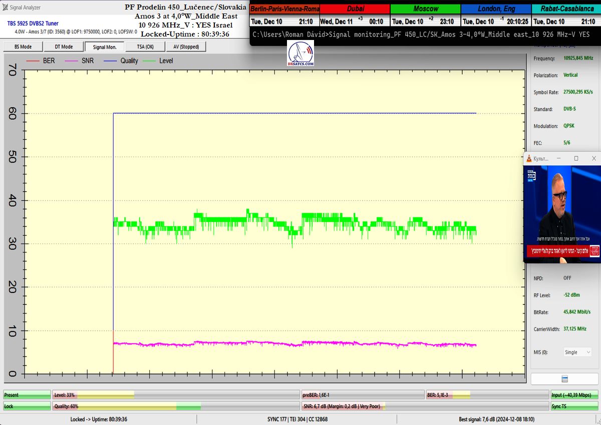 ►+29 hodín _ Priebežný stav v signálnom monitoringu dňa 8.12.2024 a online video ukážky z vysielania v ktorých nie je možné pozorovať ani jeden výpadok alebo pixeláciu obrazu