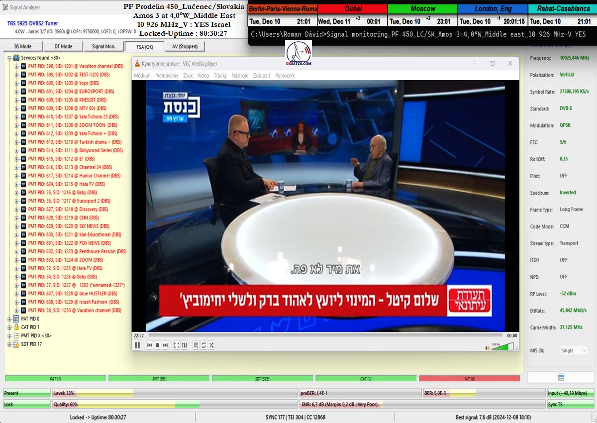 The continuous signal monitoring of frequency f = 10,926 MHz over a sufficient unitary duration of t = 80 hours, featuring unique original Israeli FTA signal distributions (e.g., Knesset channel) not broadcast anywhere else in the world except on this single frequency within the Middle East beam of the Amos 3 satellite at 4.0°W,