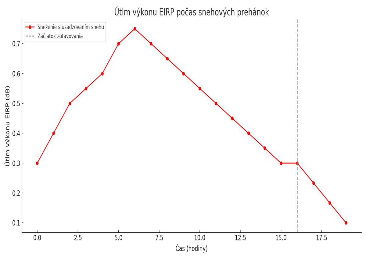 Snehové zrážky a útlm EIRP: Pri snežení je vplyv na útlm výraznejší, pretože snehové vločky majú dvojaký účinok: