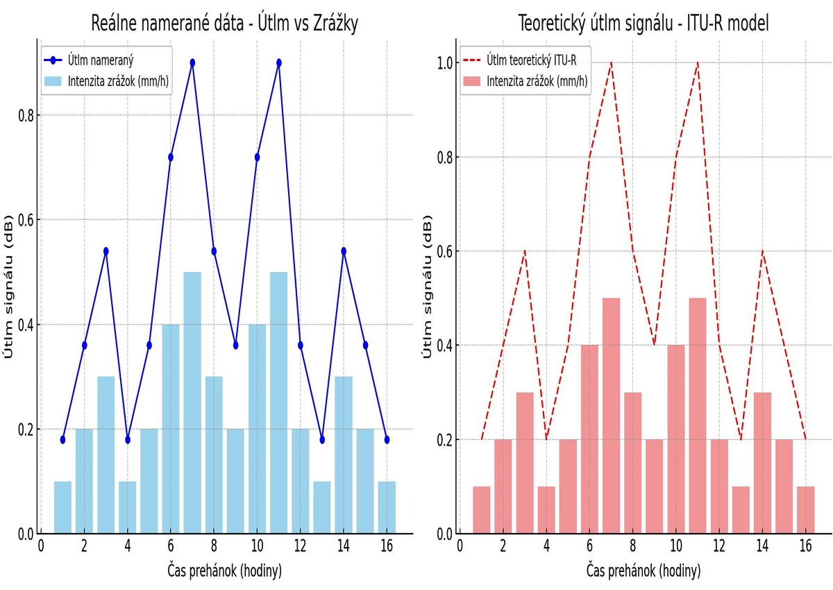 Pri vyšších hodnotách zrážok (nad 0,3 mm/hod) je útlm výraznejší a spôsobuje pokles výkonu signálu, čo môže ovplyvniť kvalitu príjmu.
