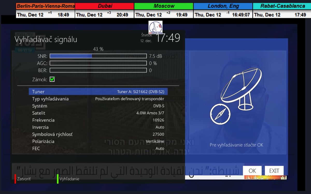 ►SK_Test funkcie môjho originálneho technologického vynálezu s názvom "Synchrónne Nanokorekcie" pri nulovej,alebo takmer nulovej úrovni signálnej rezervy a dokázaná stabilita príjmu na 100% v jednotke dokazovania t=80 hodín bez jedinej pixelácie na nosnej prenosu YES Izrael_f=10 926 MHz aj pri snehových a dažďových prehánkach ako dôsledok ultra presnej replikácie signálneho modelu do anténneho systému.