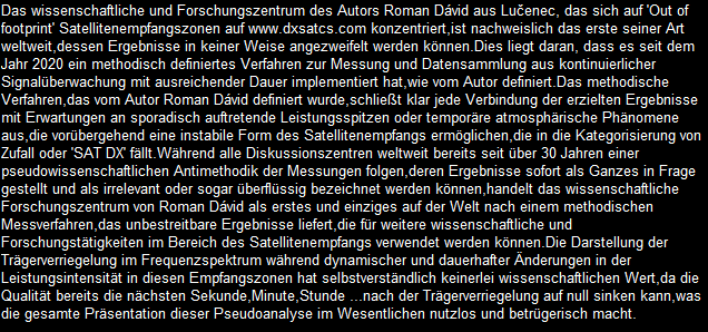 Die Empfangsstabilität wurde auch unter deutlich verschlechterten Wetterbedingungen während der ausreichend langen Überwachungseinheit t=80 Stunden nachweislich aufrechterhalten. Ich habe die minimale Überwachungseinheit t=72 Stunden trotz der ungünstigen Wetterbedingungen absichtlich nicht verkürzt,um sicherzustellen, dass niemand die Relevanz des Ergebnisses aufgrund einer kurzen Überwachungszeit in Frage stellen könnte. Ich stimme voll und ganz zu, dass ein ausreichendes Beweisgewicht zweifellos die höchste Bedeutung oder Priorität bei der Nachweisführung der Empfangsstabilität eines Trägers hat, der nur in Mikrointensität des EIRP-Signals im geografischen Gebiet Mitteleuropas verfügbar ist. Diese Region ist besonders durch hochdynamische Änderungen der Signalstärke in der nicht garantierten „Out of Footprint“-Zone gekennzeichnet.Wie aus dem Verlauf der Signalüberwachung hervorgeht, wurde eine Spitzenqualität auf einem Niveau von SNR=7,6 dB nach der erfolgreichen Anwendung meiner Technologie „Synchrone Nanokorrekturen“ demonstriert, nachdem ich die Systemdaten aktualisiert und überschrieben hatte.