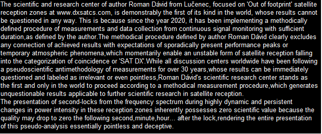 SK_Len správne zadefinovaný metodický postup meraní a zberu dát vedie k nespochybnitelným výsledkom,ktoré demonštrujú realitu satelitného príjmu v danej zemepisnej oblasti.Nesprávny,alebo tiež antimetodický a zavádzajúci postup odvodený len od publikovania samotných analýz frekvenčného spektra so zamknutými nosnými prenosu vedie výlučne len ku chybným výsledkom,úsudkom a nenaplneným očakávaniam.Antimetodické a zavádzajúce postupy sa dominantne a už desiatky rokov uplatňujú v amatérskej kategorizácii satelitného príjmu v zónach "Mimo stopy" označovaného skratkou SAT DX.