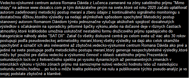 ►ÚVOD/SK : Dnes, v jednotke dokazovania a signálneho monitoringu t = 80 hodín, nespochybniteľne dokážem dosiahnutie jednej spojitej funkcie locku nosnej na frekvencii f = 10 926 MHz,aj pri pravidelných snehových a dažďových prehánkach v mieste príjmu.Pri aktuálnej výške mikrointenzity výkonu EIRP v strednej Európe na f=10 926 MHz_V ide o jednoznačný dôsledok úspešnej aplikácie jedného z benefitov môjho technologického vynálezu s názvom Synchrónne Nanokorekcie, ktorý súvisí s okamžitým a skokovým rastom signálnej kvality, konkrétne pri nulovej alebo takmer nulovej úrovni signálnej rezervy pri SNR = 6,5 dB.