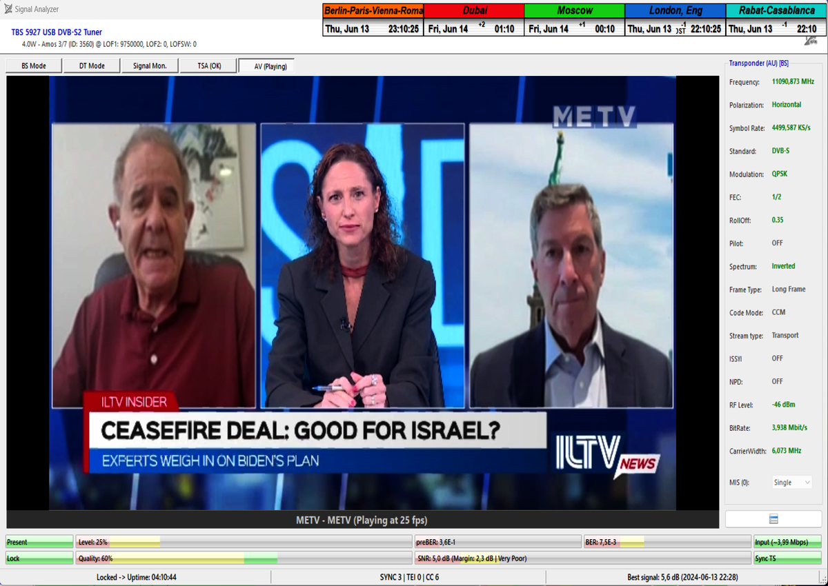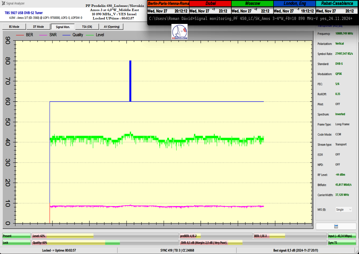 concerning the immediate signal availability of transmissions powerfully focused on the Middle East region at any second of the day. Thanks to my "Synchronous Nanocorrection" technology, there was a consistently low but stable signal margin of 1.0 to 2.5 dB/SNR during a monitoring period of t=80+ hours. Not once during this time did the signal approach the noise threshold for Lock at SNR=6.5 dB, and satellite reception remained fully stable, even under overcast skies with light rain showers.
