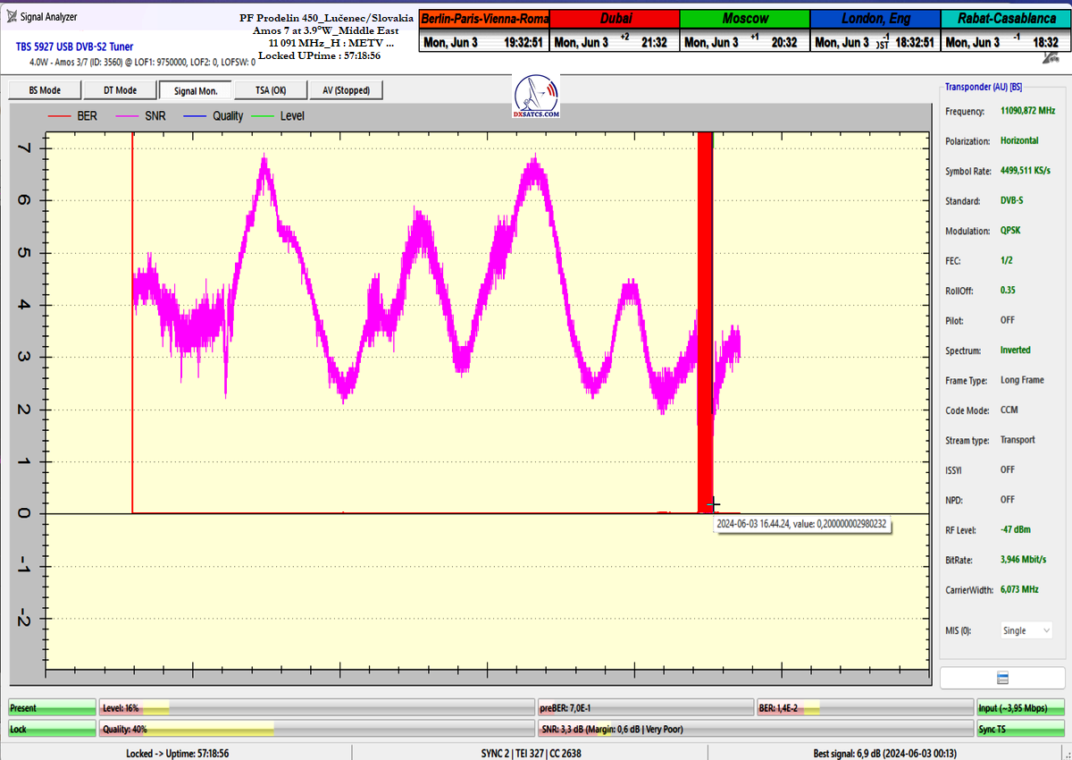 ►02, 11 091 MHz_H _ METV: Volle Empfangsstabilität bis t = 50 Stunden wurde durch einen Lock-Ausfall während eines Sommergewitters am 3. Juni 2024 von etwa 15:40 bis 17:00 CET unterbrochen Beweis Nr. 1-2 am Höhepunkt der SNR-Qualität = 6,9 dB + Beweis. Im Sommer 2024 arbeitete ich an einer kleinen Korrektur der Systemlösung im Brennpunkt der 450 cm PF-Antenne, und dabei testete ich die Genauigkeit meiner Verfahren für das Signalmonitoring von METV bei f = 11 091 MHz von Amos 7. Dadurch wurde mir klar, dass das Attribut der Referenzfrequenz von dieser Frequenz entfernt werden muss, basierend auf den Ergebnissen des Monitorings, und ich habe anschließend das Attribut der Referenzfrequenz f = 10 890 MHz_V dem gesamten Middle East-Diagramm zugeordnet.**