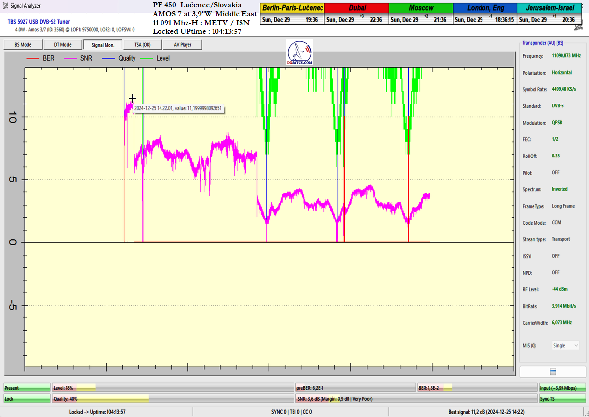 DE : Die folgenden Spektrums- und Qualitätsanalysen mit den Analysatoren Televes H60 und Metek HD wurden unter deutlich schlechteren Wetterbedingungen durchgeführt. Aus diesem Grund erreicht die Spitzenqualität bei weitem nicht das Niveau, das während des Signalmonitorings in der Einheit t=101 Stunden erzielt wurde, d.h. etwa SNR=8,2 dB. Diese die Empfangsqualität stark beeinträchtigenden Wetterbedingungen bestehen am Empfangsstandort Lučenec seit dem Abschluss des Monitorings am 14. Januar 2025. Bis heute war es mir nicht möglich, Spektrums- und Qualitätsanalysen unter vergleichbaren Wetterbedingungen durchzuführen,wie sie während des Signalmonitorings vom 10. bis 14. Januar 2025 vorherrschten. (Aktueller Wetterzustand zum Zeitpunkt der Veröffentlichung der Neuigkeit als Beweis