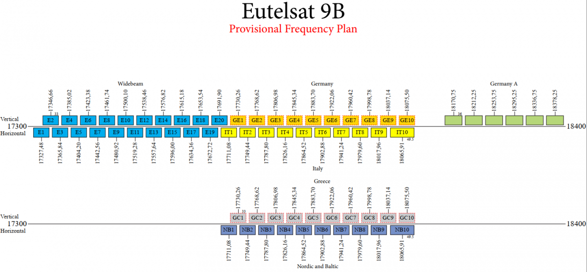 ►►Eutelsat 9B at 9.0°E-Italy-Ku-DVB-S2-S2X-Multistream : UPLINK & DOWNLINK Frequency Plan