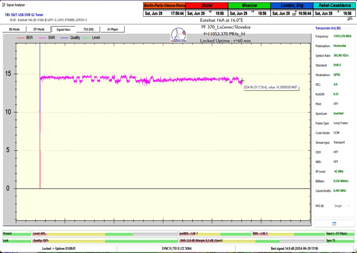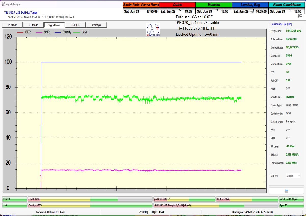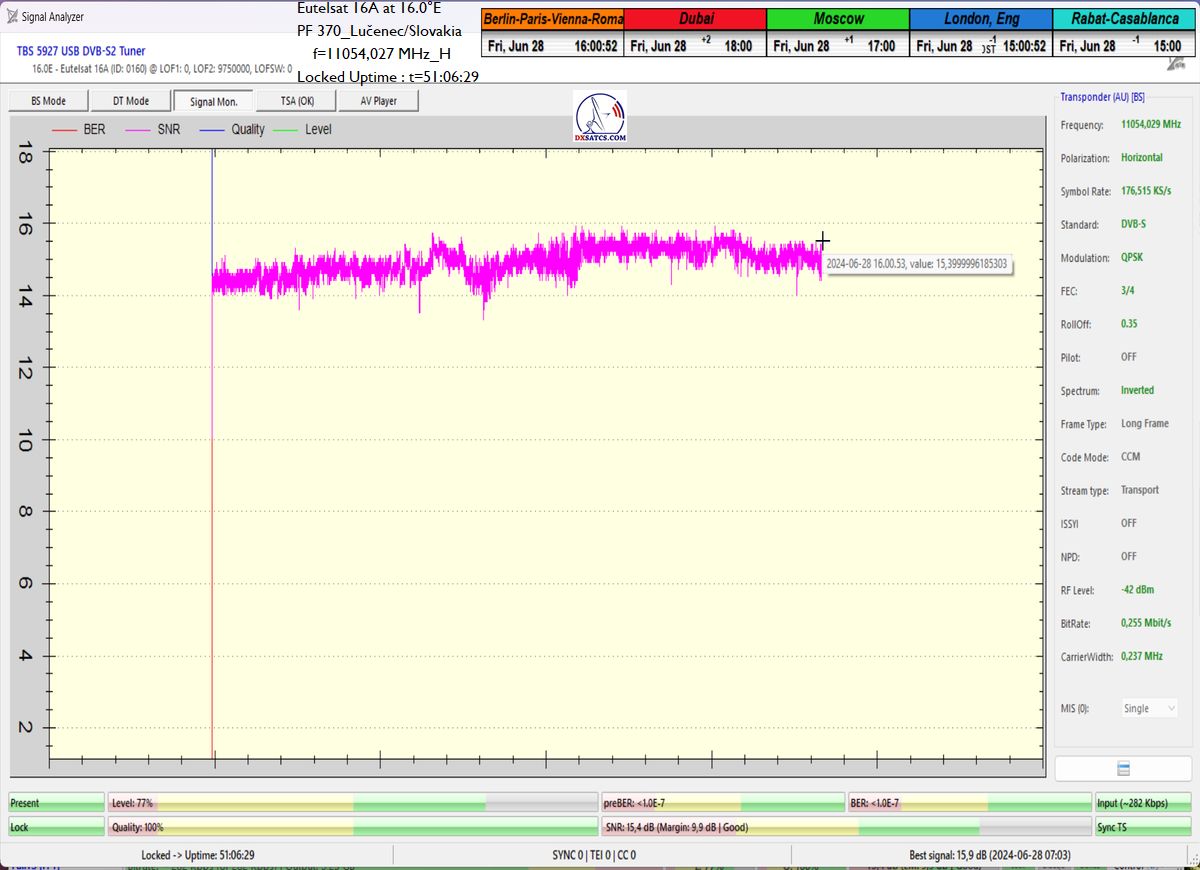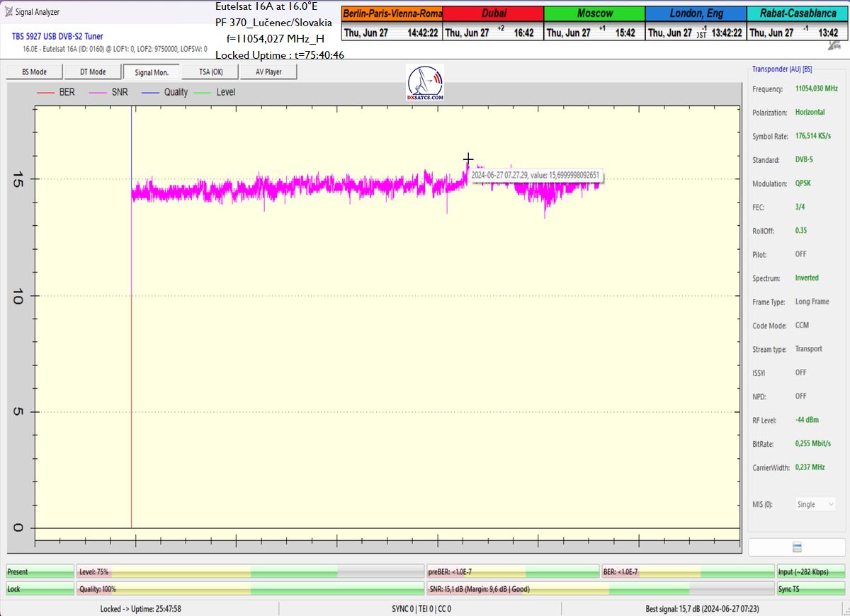 ►Klasifikácia dosiahnutých výsledkov na f=11 054,170 MHz: Dokazovanie v jednotke monitoringu t=75 hodín týmto nespochybniteľne verifikuje stabilitu príjmu na 100% pre rádio prenos s SR=176 ksym/s,čo je v priamom vzťahu so stabilne vysokou intenzitou výkonu okolo EIRP=49 dBW v stredoeurópskej zóne príjmu z vyžarovacieho diagramu EUROPE A na výstupe zo symetrického reflektora s D=370 cm s typickou výškou rezervy v kvalite príjmu okolo 9-10+ dB počas dňa.