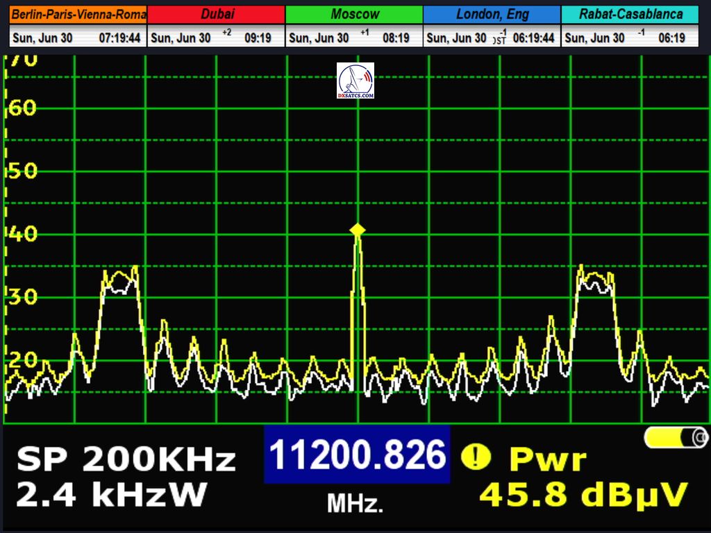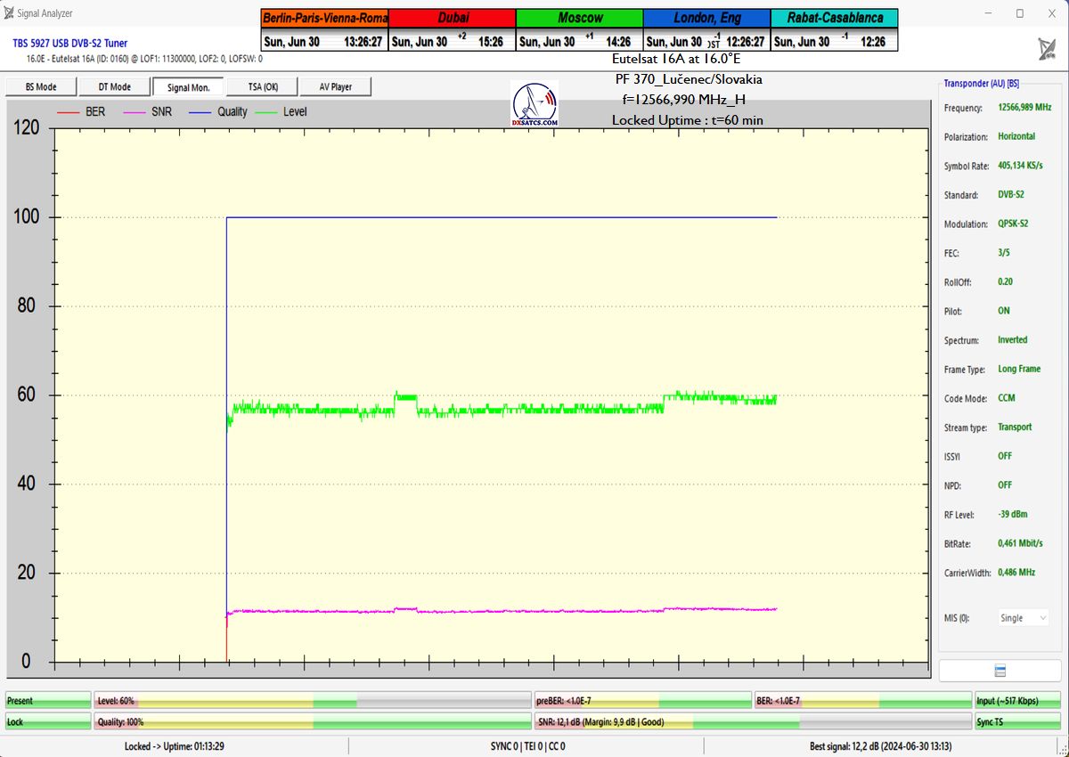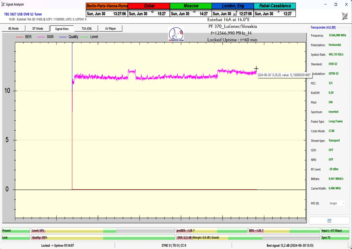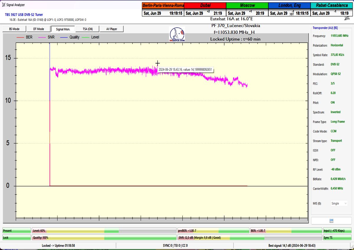►Klasifikácia dosiahnutých výsledkov na f=11 054,170 MHz: Dokazovanie v jednotke monitoringu t=75 hodín týmto nespochybniteľne verifikuje stabilitu príjmu na 100% pre rádio prenos s SR=176 ksym/s,čo je v priamom vzťahu so stabilne vysokou intenzitou výkonu okolo EIRP=49 dBW v stredoeurópskej zóne príjmu z vyžarovacieho diagramu EUROPE A na výstupe zo symetrického reflektora s D=370 cm s typickou výškou rezervy v kvalite príjmu okolo 9-10+ dB počas dňa.