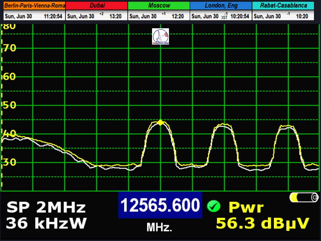 radio carrier Q-Music NL AMS at f=12,567.994 MHz through LOF2 and 12,567.941 MHz through LOF1, resulting in an offset of exactly 53 kHz between