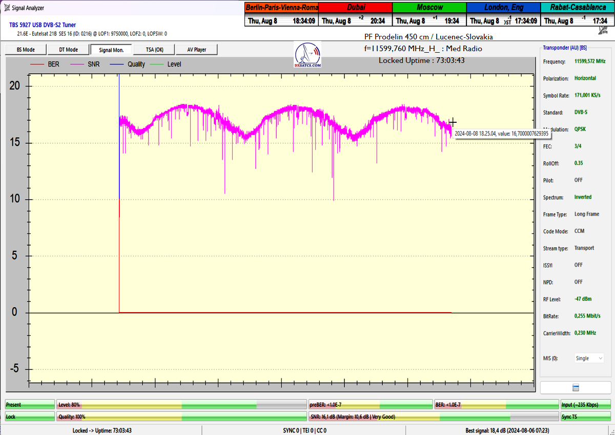 ►Eng_Classification of achieved results at f=11 599,760 MHz: Signal monitoring over a unit length of t=72 hours irrefutably proves that I have achieved 100% reception stability in practice, without a single interruption in Lock continuity throughout the entire monitoring period. The daily peak quality oscillated around an SNR of 18.4 dB, which provides an immediate quality margin of nearly 13 dB with, of course, a zero level of Viterbi Precorrection <1.0E-7. Occasional drops in instantaneous quality never exceeded an SNR of 9.7 dB.