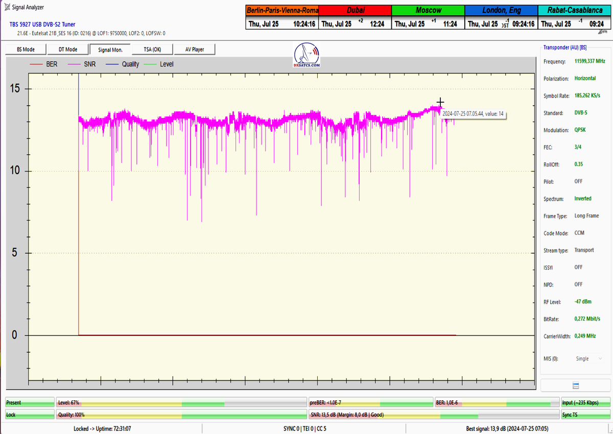 ►Klasifikácia dosiahnutých výsledkov na f=11 599,530 MHz: Vizualizovaná forma dokazovania v celkovej jednotke monitoringu t=97 hodín na rádio nosnej Medina FM na f=11 599,530 MHz s aplikovanou hodnotou SR=185 ksym/sec,týmto nespochybniteľne dokazuje že som dosiahol stabilitu príjmu na 100% bez jediného výpadku v kontinuite Locku nosnej so špičkou kvality SNR=14 dB,pri typickej a permanentne oscilujúcej aplitúde okamžitej rezervy v rozsahu od 7 do 8,5 dB.Vysoký počet v grafe vizualizovaných prepadov v intenzite výkonu a následne kvality,ktoré nijako nesúvisia s prípadným tienením traektórie elektromagnetického vlnenia z družice,(pretože sa opakovali aj na PF 370 s výhľadom na 100% nie len na PF 450 cm)nikdy nedosiahli šumový prah a oscilovali v pásme relatívne vysokej rezervy kvality príjmu.Obsadenie TP DW7 sa zmenilo,v porovnaní s naposledy vykonaným signálnym monitoringom nosnej Medina FM dňa 26.9 > 27.9.2023 + 6.10.2023 > 7.10.2023,čiže nemá význam porovnávať a prípadne vysvetľovať príčiny výrazného rastu dosiahnutej špičky kvality z pôvodnej hladiny SNR=11,4-11,6 na súčasnú špičku SNR=13,9-14 dB,ale faktom ostáva že LNB SMW ostal rovnaký a že som pôvodne použitú polarizačnú výhybku SMW OMT vymenil za : "Romanom Dávidom navrnuté systémové riešenie z roku 2008 tvorené len jedným kusom zlievarenského odliatku (nie z CNC alebo sústruhu),s fyzikálnymi úpravami,ktoré minimalizujú akékoľvek odrazy vlnenia,maximalizujú jeho signálnu priepustnosť,pri vysokej vodivosti tubusu,s konkrétnym zameraním na prevedenie vlnovodnej príruby "