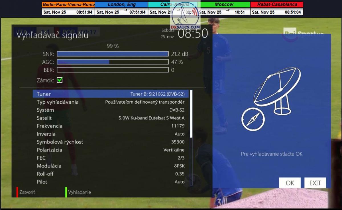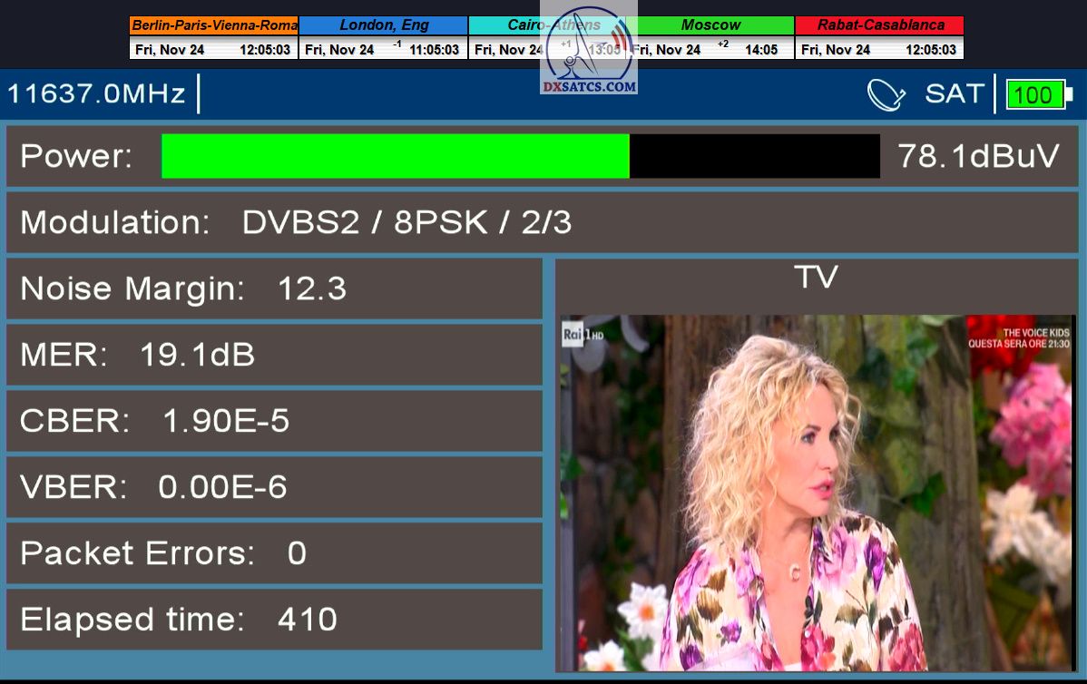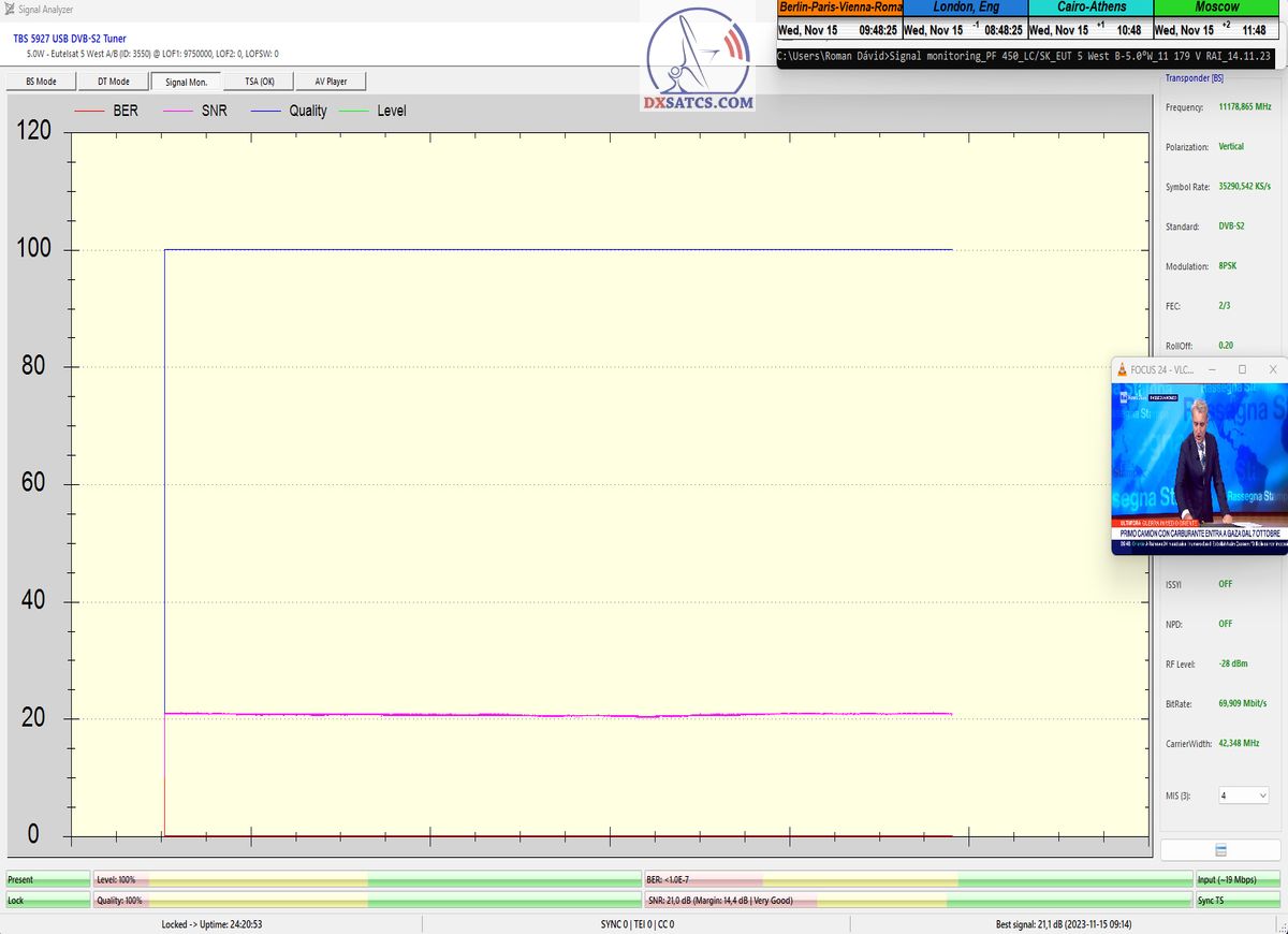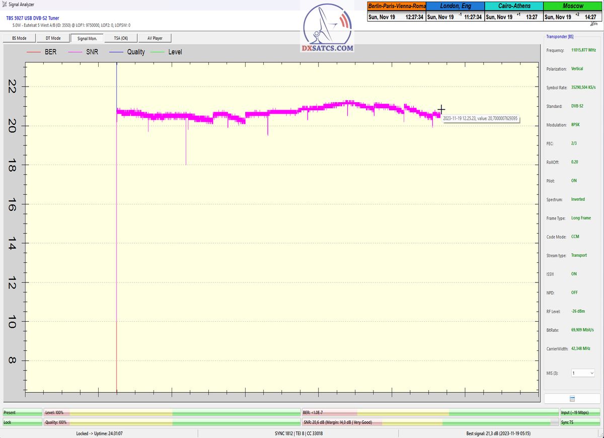 Na príklade dokazovania v podobe signálneho monitoringu paketov Rai a Canal+,vysielaných v technologickom štandarde DVB-S2/Multistream z objektu Eutelsat 5 West B na 5,0°W,Vám dnes dokážem že som účinne a hlavne stabilne transformoval relatívne vysokú intenzitu vyžiareného výkonu EIRP na výslednú kvalitu ,ktorú kvantifikujem pomerom signálu k šumu SNR=20>21+ dB-pri aplikovanej konfigurácii modulačných