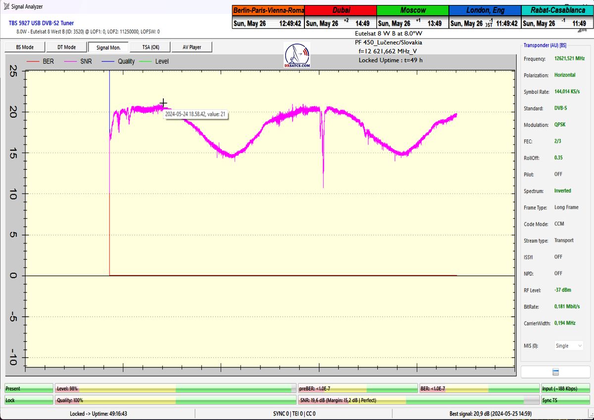 výrazne osciluje od približne 14 do 21 dB v jednotke odstupu Šignal/Šum_SNR a pri prechode prívalových búrok výrazne klesá až na 10,5 dB, pri dostatočne vysokej okamžitej rezerve okolo 5 dB.Typická výška signálnej rezervy pri štandardných a výrazne nezhoršených poveternostných podmienkach osciluje v rozsahu od 9 do 16,5 dB.Spracovanie rádiových nosných s vyššími úrovňami symbolových rýchlostí ako SR>200 ksym/s nepovažujem z technologického hľadiska za nič fyzikálne a ani softwérovo zložité a neštandardné z pohľadu dosiahnutia kontinuity LOCK-u a v podmienkach provajderom garantovane vysokých intenzín výkonu (EIRP=53 dBW) v európskom vyžarovcom diagrame družice Eutelsat 8 West B ich stabilitu príjmu nemusím a ani nebudem dokazovať a zvolil som len minimálnu verifikačnú jednotku t=60 minút,aby som sa vyhol prezentácii "bezcenných" sekundových Lockov z frekvenčného spektra.