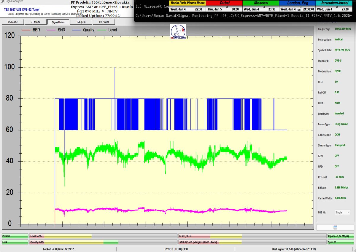 SK_Výsledky signálneho monitoringu nespochybnitelne dokazujú že som v jednotke monitoringu t=77 hodín,nosnej frekvencie NNTV na f=11 070 MHz_V, dokázatelne dosiahol stabilný príjem na 100% bez výskytu čo i len jedného výpadku v spojitosti priebehu funkcie Locku alebo pixelácie. Zaznamenal som špičku kvality SNR=10,7 dB a jediný výskyt poklesu modrého priebehu kvality Q na hladinu Q=40% sa odohral presne 1x a to po príchode búrkovej oblačnosti a výskyte dažďových prehánok dňa 1.6.2025 presne o 20:35 SEČ,čo nespochybniteľne dokazujú výsledky meraní úhrnu zrážok zo zdroja shmu.sk.