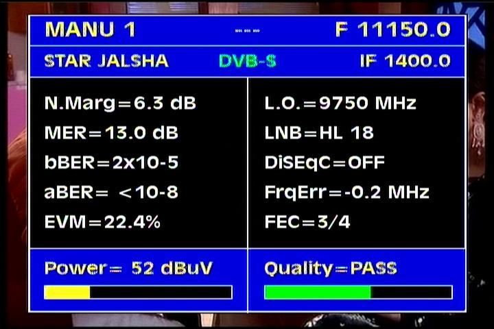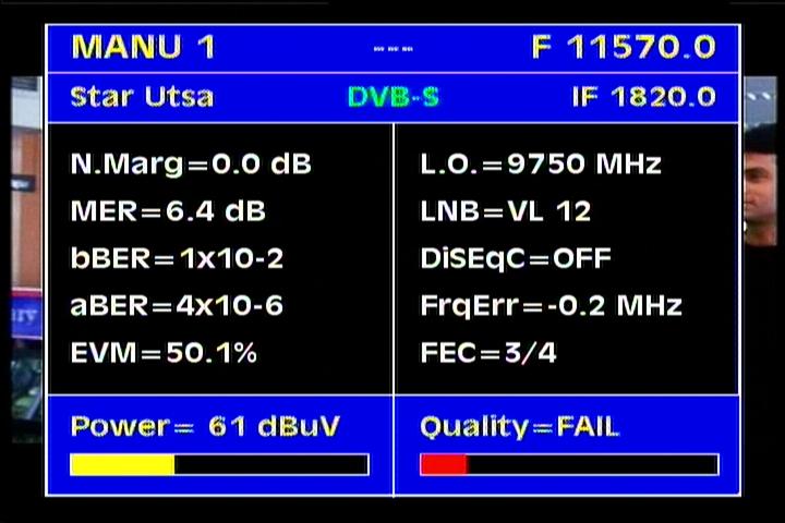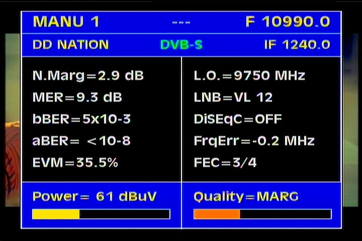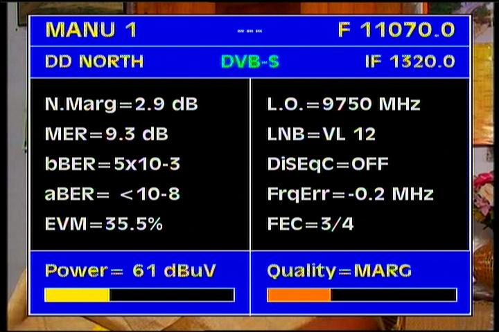 of reception follows.Average reception quality, expressed in the unit MER=9.5-11.5 dB (with occasional peak at MER=15+ dB)