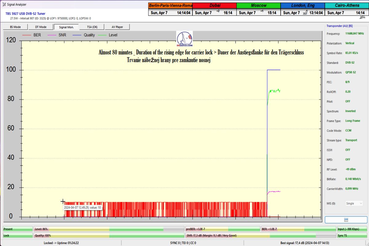 že som dosiahol jeden konštantný priebeh LOCK-u so špičkou kvality SNR=17 dB,bez jediného výpadku v kontinuite kvality Q, inak povedané dôkazná