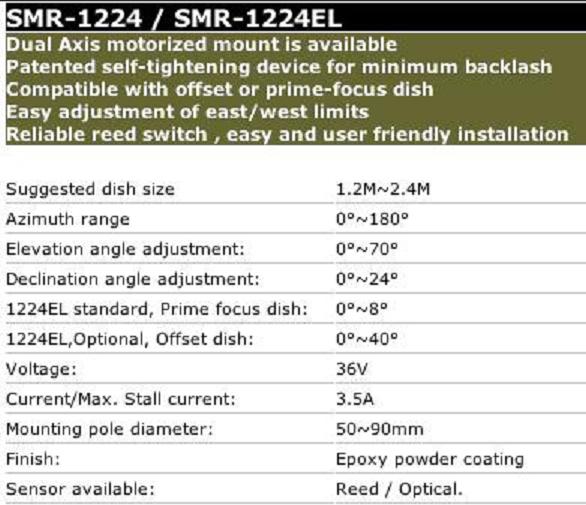 The SMR-1224 horizon to horizon motor is suitable for dish sizes from 1.2m to 2.4m - maybe HIGHER depend on weight !!! . The pole (order separately) can be as small as 2" diameter for small dishes, and up to 3.5" diameter for large dishes. A threaded rod provides elevation adjustment. Weight: 15.5kg