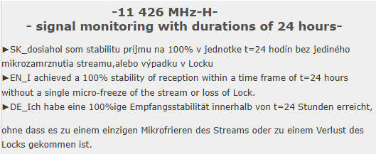 ►EN_Classification of achieved results at f=11 426 MHz_H: The results of signal monitoring over time units t=24 and t=72 hours irrefutably verify that I have achieved 100% reception stability without a single loss of lock or stream freeze in the t=24-hour monitoring unit in the city of Lučenec, located in the south of central Slovakia. In the t=72-hour monitoring unit, I achieved a reception stability of 99.99%, where out of a total of 259,200+ monitored seconds, micro-freezing of the stream occurred for only ten seconds in total. However, there was not a single loss of lock during the t=72-hour period, as the recovery from micro-freezing to lock continuity was instantaneous at every occurrence and repetition. This is further confirmed by the absence of any red areas in the signal monitoring data, which demonstrably never appeared even once over the 72-hour period.