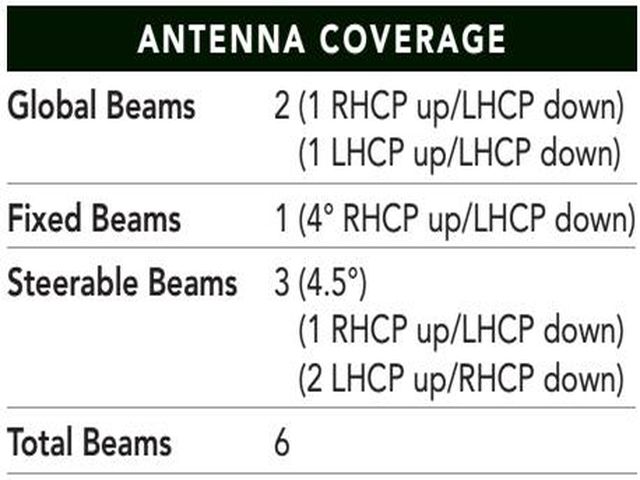 area. It carries a global beam, a fixed spot beam over the Eastern U.S., and three spot beams that can be
