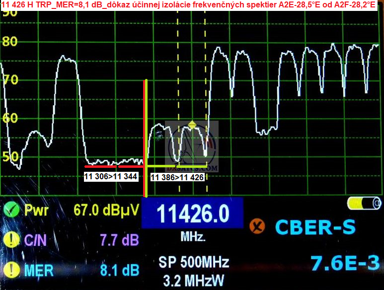 takže pri Locku referenčnej nosnej frekvencie na f0=11 426 MHz-H z A2E nevidíte vo frekvenčnom spektre ani náznak sedla nosnej na f=11 305/11 311 MHz-H z družice A2F,