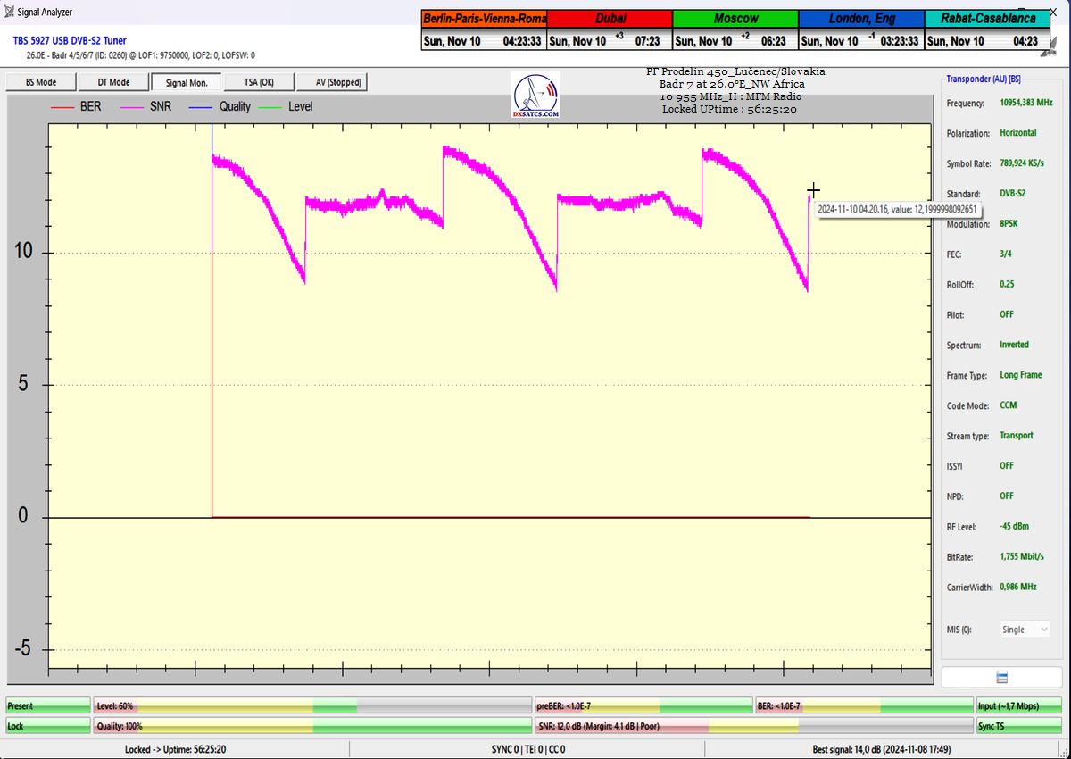 ►►Badr 7 at 26.0°E-Northwest Africa : Continuous signal monitoring / Nepretržitý signálny monitoring