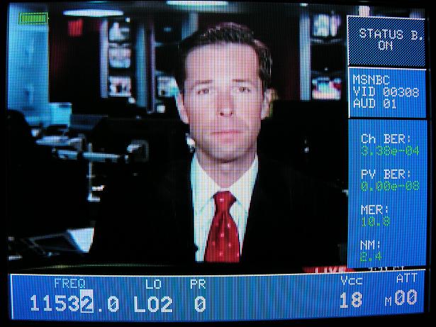 V kmitočtovom spektre TP 14 H satelitu Telstar 12 z orbitálnej pozície 15,0°W som identifikoval na f=11 532 MHz originálne americké vysielanie MSNBC TV,pri ktorom okamžitá akosť vyjadrená v MER=11,1 dB a Ch BER 3.86-04 vyjadruje plnú stabilitu príjmu s PF 365 cm .