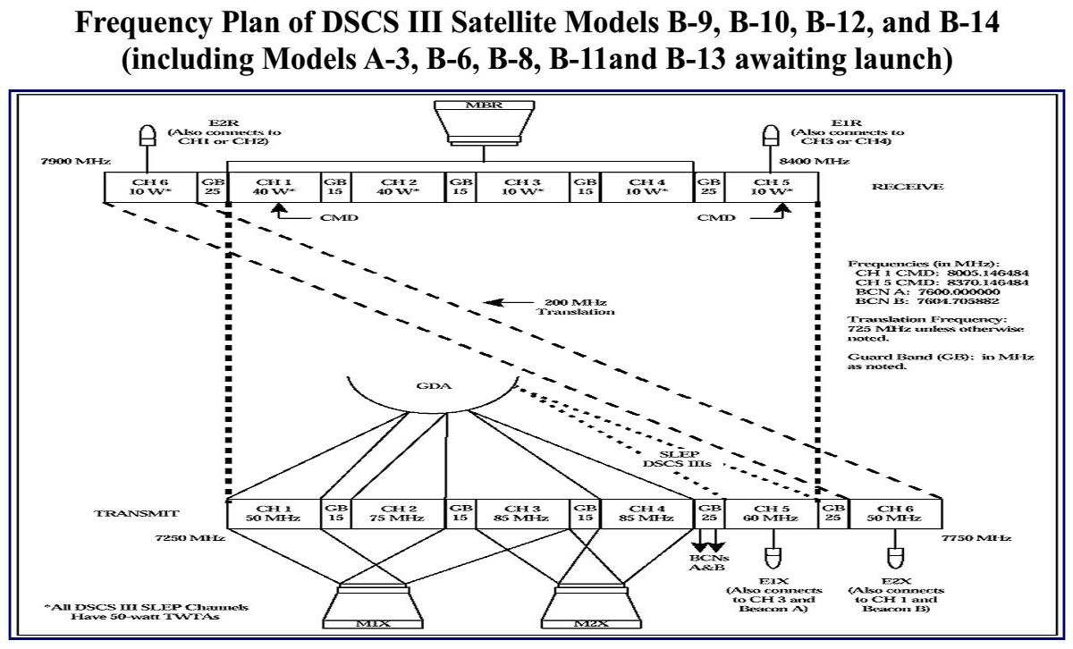 ►USA-170-DSCS-3 B6-downlink frequency plan of DSCS 3 satellite-X band : 7 250-7 750 MHz / 7 900-8400 MHz